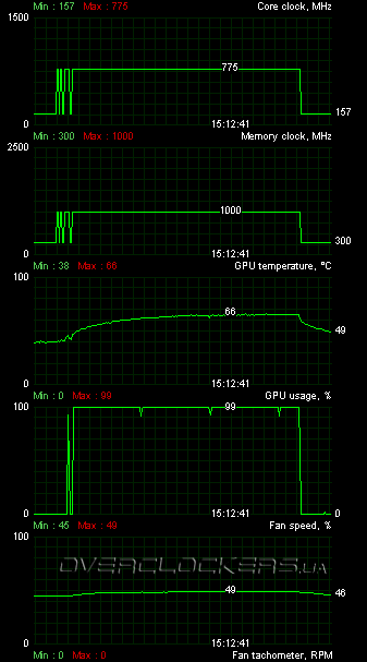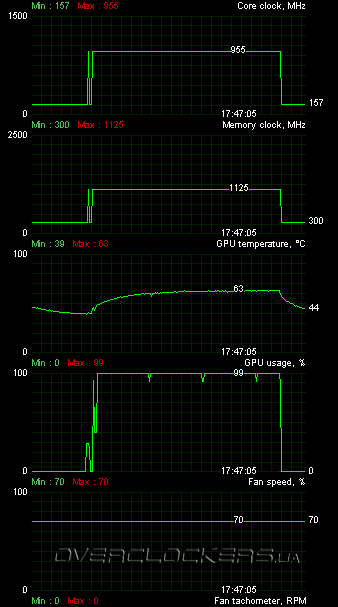 Результатами разгона HIS IceQ порадовал. Потенциал памяти GDDR5 не самый высокий — 4500 МГц. Зато GPU смог без проблем работать на 955 МГц, что лучше результатов, рассмотренных нами ранее Radeon HD 5670 и Radeon HD 6670. Учитывая отличные температурные показатели в номинале, мы вначале решили проверить работоспособность на таких частотах при фиксации оборотов обдувающего вентилятора на 50%. Но после длительного прогрева в тестах начались зависания. И дело, наверное, не столько в перегреве GPU (потому как температура выросла незначительно), сколько в перегреве других компонентов. В частности, важную роль при разгоне играет поддержание нормального температурного режима силовых элементов цепи питания. А в данном никакого активного охлаждения и обдува «мосфетов» нет. Но при повышении оборотов вентилятора «турбины», снижается не только температура ядра, но и частично общая температура платы с компонентами. Поэтому немного подняв обороты (до 70%), мы избавились от всех проблем и добились полной стабильности.