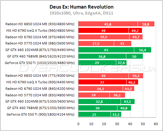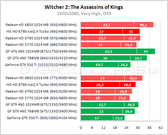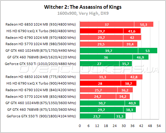Radeon HD 6790 легко справляются с низким разрешением, но в 1920x1080 при максимальных настройках (без «Запредельного качества») производительности этих видеокарт в Witcher 2: The Assassins of Kings не хватает. HIS уверенно обгоняет GeForce GTX 550 Ti и идет почти наравне с младшим GeForce GTX 460, хотя и уступает ему немного по минимальному fps. С разгоном производительность видеокарты возрастает примерно на семь процентов.