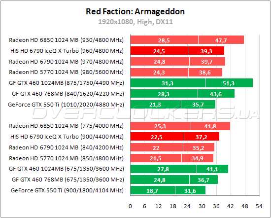 Между двумя Radeon HD 6790 в Red Faction: Armageddon небольшая разница — менее шести процентов. HIS быстрее GeForce GTX 550 Ti, но немного слабее 192-битного GeForce GTX 460. Обогнать этого конкурента удается при разгоне.