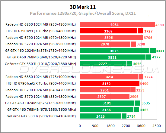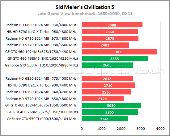Немного неожиданно HIS удается в номинале продемонстрировать результат выше чем у Radeon HD 6850. С обычным Radeon HD 6790 разница в 7%. Младший GeForce GTX 460 быстрее на 5%, GeForce GTX 550 Ti хуже на 16%.