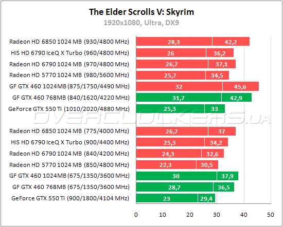 В Skyrim адаптер HIS быстрее собрата на 5%. GeForce GTX 550 Ti слабее на 16% по среднему fps и на 10 по минимальному. Младший GeForce GTX 460 снова быстрее HIS.