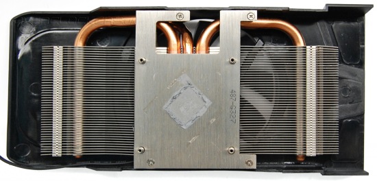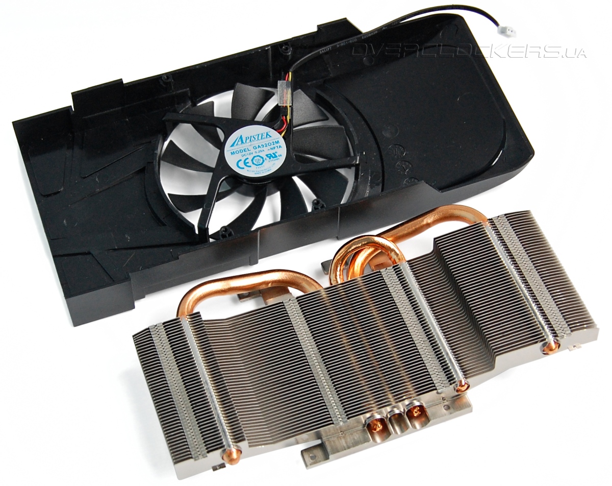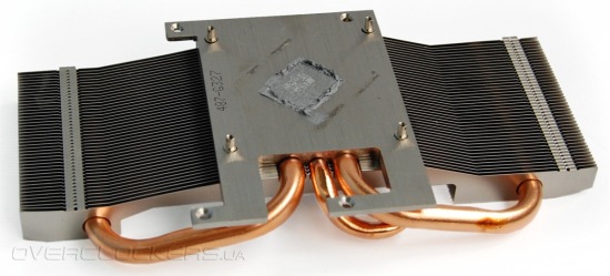 Кулер состоит из трех медных тепловых трубок, пронизывающих цельную секцию тонких алюминиевых пластин, и массивного основания.