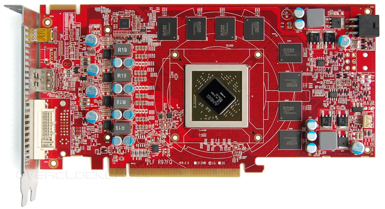 Один гигабайт видеопамяти набран восемью микросхемами Elpida W1032BBBG-50-F со временем доступа 0,8 нс (то есть они теоретически могут работать на 5 ГГц за счет QDR). Впрочем, практика показывает, что такие частоты для Barts недостижимы из-за особенностей встроенного контроллера.