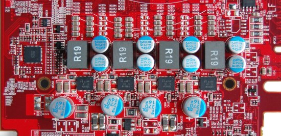 Задействованы все четыре фазы питания (у Radeon HD 6850 их три) на DrMOS-элементах 59901M от Texas Instruments. Радиатора на микросхемах нет. Управляющие функции возложены на контроллер uP1633P от uPI Semiconductor.