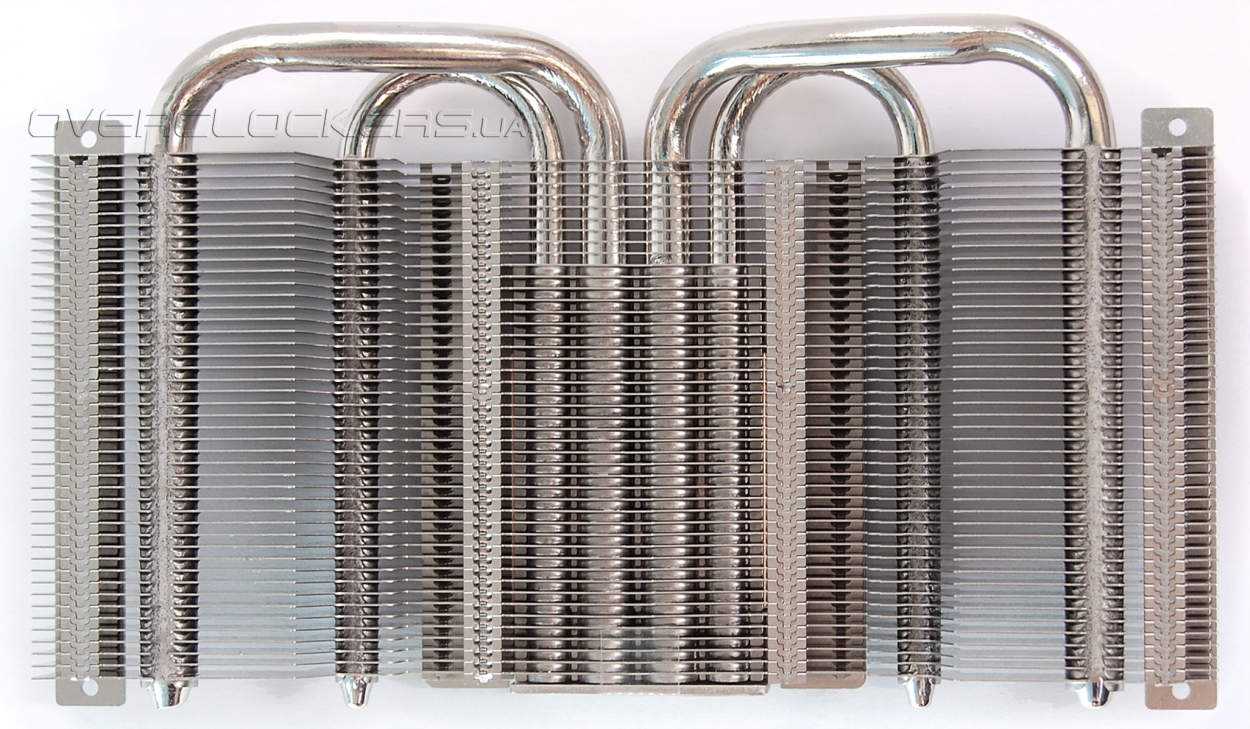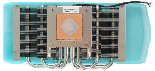 Система охлаждения точно такая же, как и у ранее описанной модели, лишь пластиковый кожух стал чуть длиннее. Медное основание, четыре тепловые трубки (центральные по 8 мм) и радиатор из 45 алюминиевых пластин.