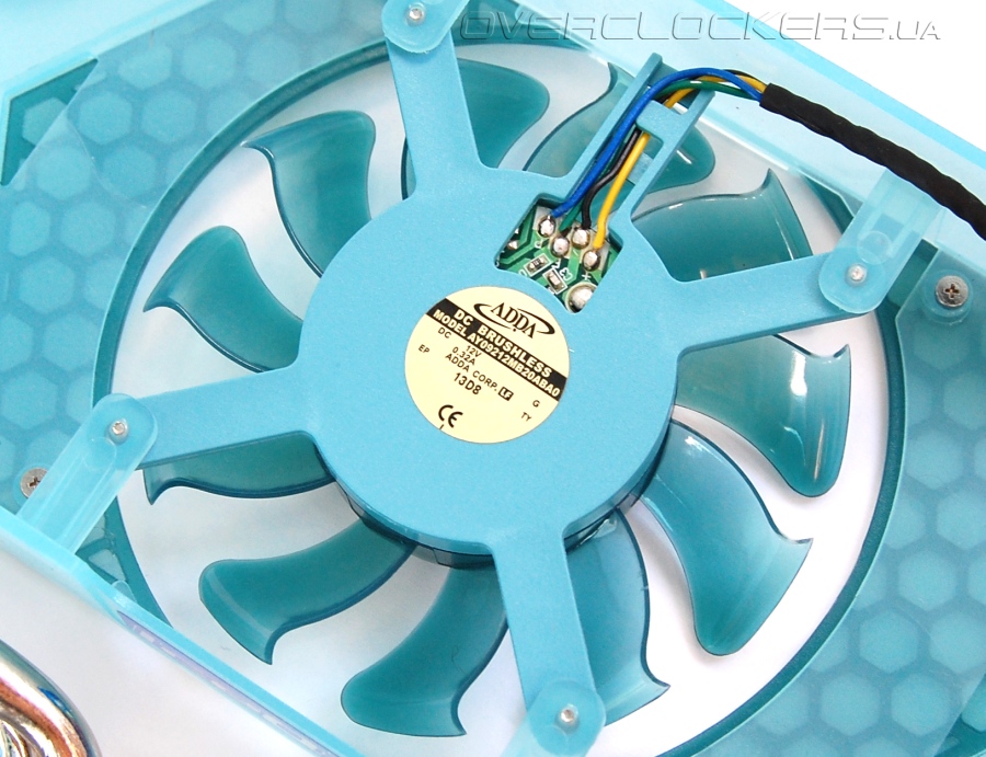 Обдув осуществляется вентилятором ADDA DC Brushless AY09212MB20ABA0 с диаметром крыльчатки 85 мм. Особая форма лопастей с загнутыми краями обеспечивает обдув боковых секций радиатора.