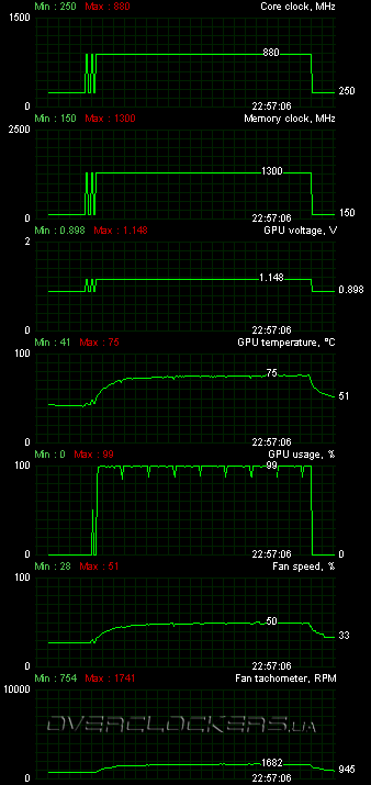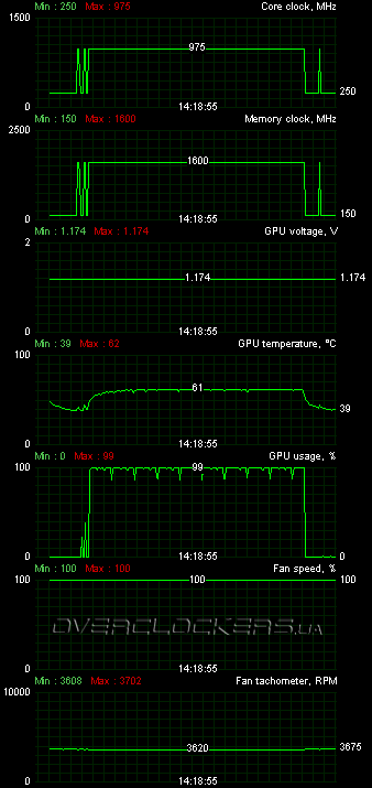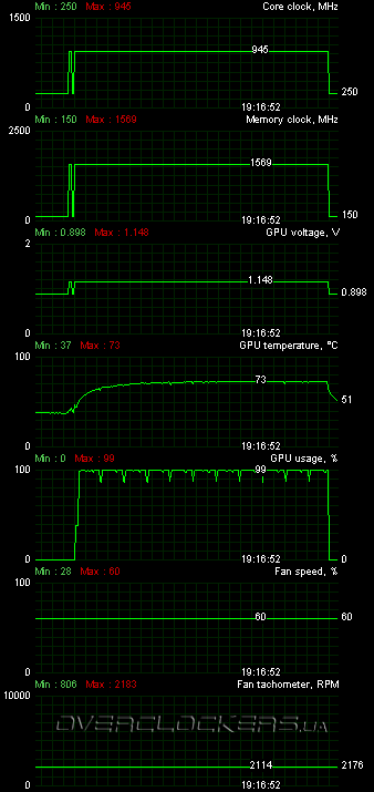 Без проверки на разгон при умеренном шуме не обошлось и в этот раз. Ограничившись стандартным напряжением, мы смогли добиться стабильности на частотах 945/6276 МГц. Правда в этот раз обороты пришлось повышать до 60% (немного выше 2100 об/мин), но шум был еще не критичен и вполне терпим. Многие топовые видеокарты и без разгона оказываются шумнее.