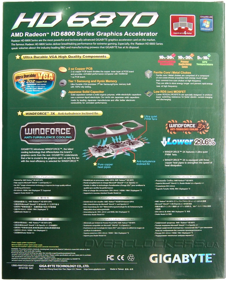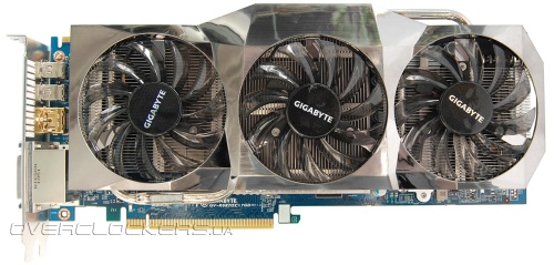 Стоит отметить, что аналогичная трехвентиляторная система охлаждения используется и в старших видеокартах Gigabyte из серий GeForce GTX 580, GeForce GTX 570 и GeForce GTX 580. Так что, на более прохладном GPU Barts можно ожидать отличных температурных показателей при минимальном уровне шума.