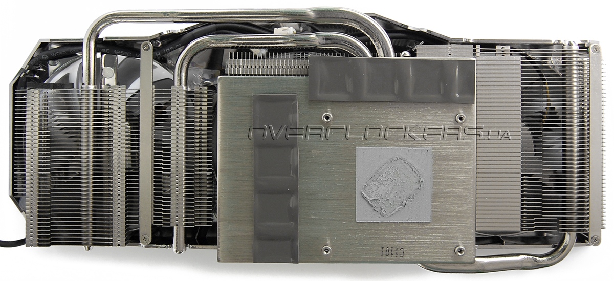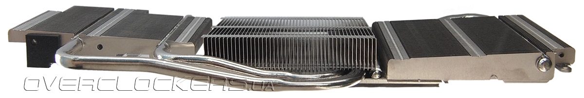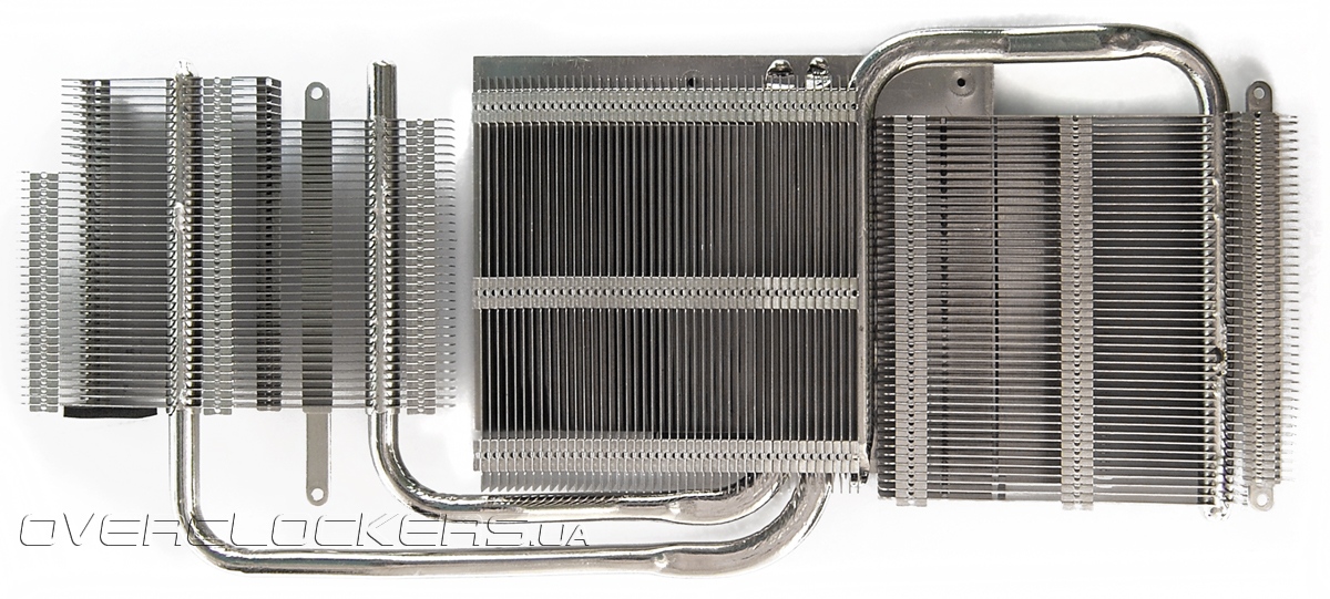 Радиатор состоит из трех секций, каждая из которых сориентирована в соответствии с положением вентиляторов из-за чего пластины имеют трапециевидную форму. При виде сбоку хорошо видно, что крайние вентиляторы имеют наклон к центру видеокарты, а средний расположен под углом к разъему PCI Express