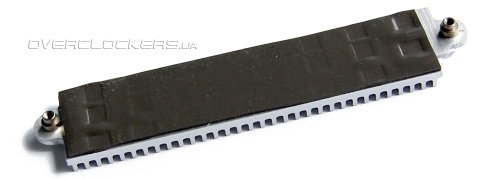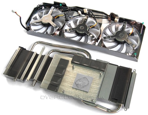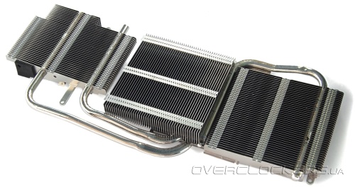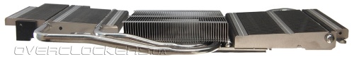 Массивное медное никелированное основание контактирует одновременно с GPU и микросхемами памяти. На него напаяны три изогнутые тепловые трубки с нанизанными пластинами радиатора.