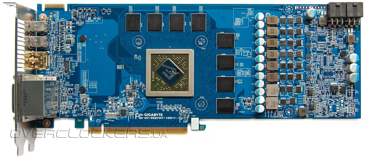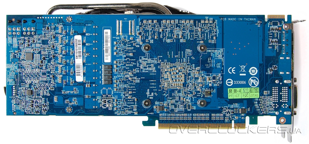 Дизайн PCB кардинально отличается от стандартного. За основу взят адаптер GV-R687SO-1GD из серии Super Overclock с небольшими упрощениями. На задней стороне платы имеется пустое посадочное место под высокоемкостной конденсатор Proadlizer, но распаяны четыре танталовые конденсаторы NEX. Спереди видны пустые места под несколько микросхем. Одно из этих мест подходит под 20-контактный PIC-контроллер, который обычно используется на картах Gigabyte для управления функциями мониторинга и контроля напряжений через программную оболочку Gigabyte OC Guru. И действительно, поддержки GV-R687OC-1GD в утилите нет, а софтвольтмод в MSI Afterburner тоже не доступен.