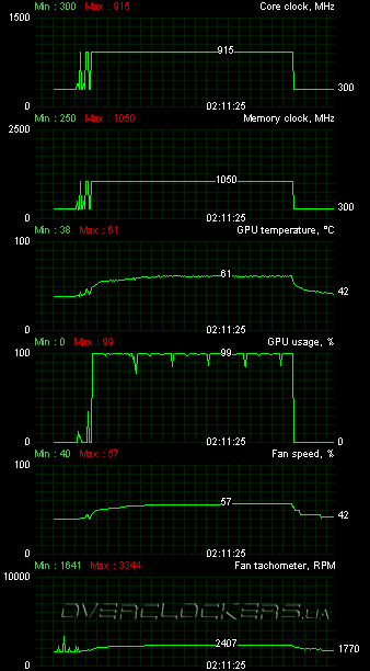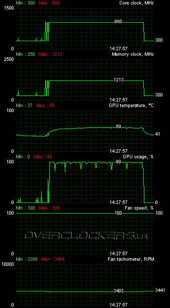 Как отмечалось выше, программными средствами напряжение GPU не контролируется, хотя разгон от этого не сильно пострадал. Мы без проблем достигли 980 МГц, хотя для полной стабильности пришлось поднимать обороты до максимума. А вот память порадовала, заработав на 4852 МГц.