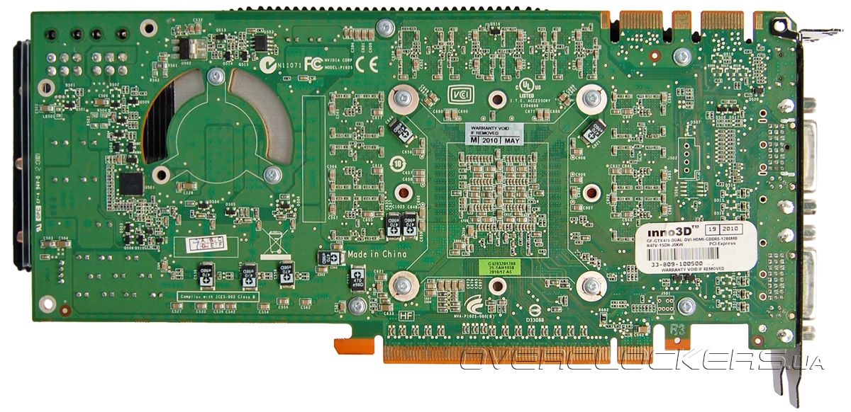 Как уже отмечалось выше, плата выполнена по референсному образцу и ничем не отличается от прочих GeForce GTX 470. Подсистема питания GPU реализована по четырехфазной схеме под управлением контроллера NCP5388.