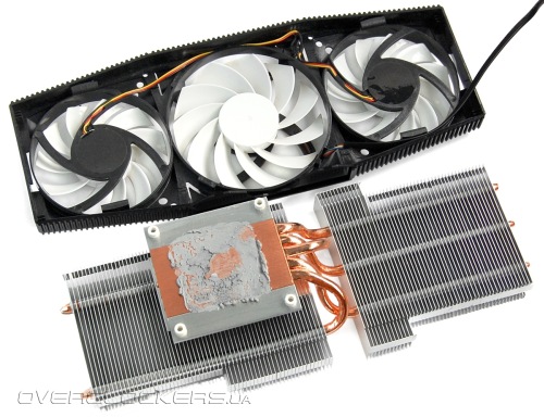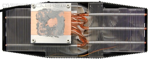 Радиатор состоит из двух секций пластин, нанизанных на пять тепловых трубок, выходящих из массивного медного основания.