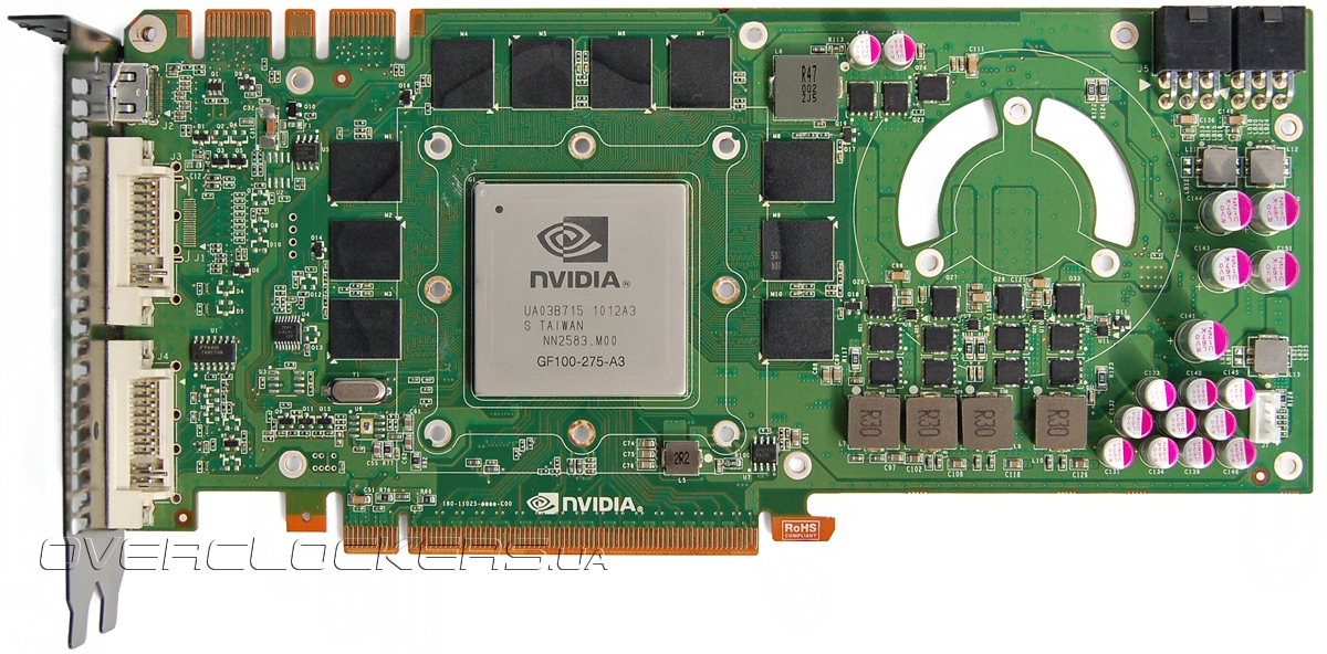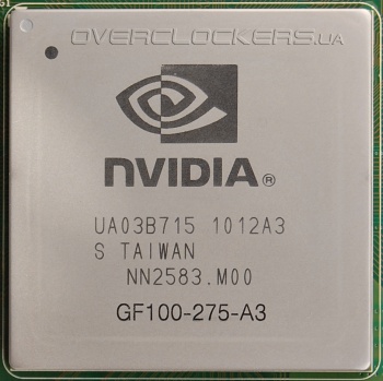 Графический чип GF100-275-A3 «урезан» до активных 448 CUDA-процессоров, 56 текстурных блоков и 40 ROP.
