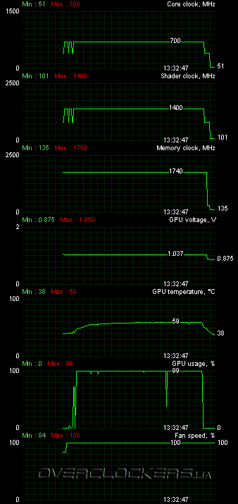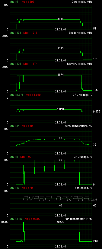 Разгоном iChill GTX 470 Hawk откровенно разочаровал. Ядро при повышенном напряжении могло кратковременно работать и на 800 МГц. Память сохраняла временную работоспособность на частотах до 3900 МГц, при повышении напряжения на ядре — до 4000 МГц. Кстати, зависимость потенциала памяти от напряжения на ядре мы замечали и на других GeForce GTX 470. Но в данном случае от этого потенциала практического толку ноль. Несколько минут работы в Crysis: Warhead приводили к сбросу видеодрайвера, артефактам или зависанию системы. Играя с частотами, мы обнаружили, что такие проблемы сохраняются даже при значительно более низких частотах, и при длительной работе время стабильного функционирования постепенно уменьшается даже при снижении частот и напряжений. Перегрев? Но ядро холодное и не успевает даже до 60 °С нагреться! А вот плата под системой питания была просто раскалена. Похоже, наши подозрения о невысокой эффективности радиатора-пластины оправдались. В итоге, мы смогли пройти все тесты лишь на частоте ядра 700/1400 МГц при пониженном напряжении 1,037 В (номинал карты 1,050 В).