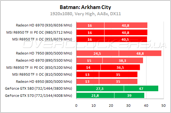 Старые Radeon в Batman: Arkham City значительно уступают видеокартам NVIDIA, особенно по минимальному fps. При разгоне оба видеоадаптера MSI вполне сопоставимы с разогнанным ASUS EAH6970 DCII/2DI4S/2GD5.