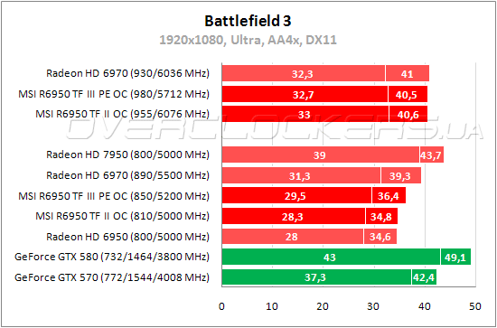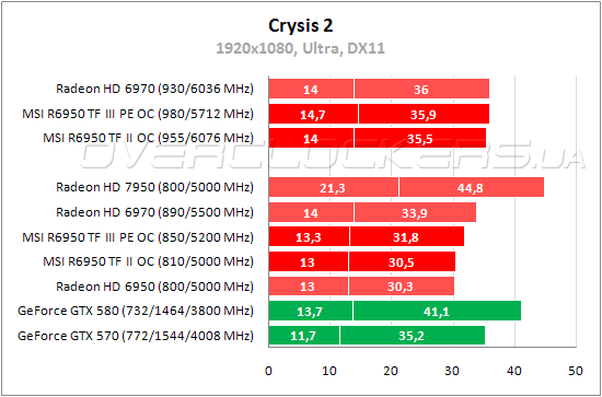 В Crysis 2 при максимальном качестве графики оба Radeon HD 6950 едва выдают 30 fps и демонстрируют очень низкий минимальный фреймрейт. Разница между картами MSI вновь небольшая, а при разгоне их производительность идентична результатам Radeon HD 6970 на частотах 930/6036 МГц.