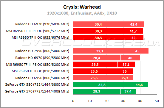В Crysis: Warhead между двумя видеокартами MSI разница составляет около трех процентов. При разгоне R6950 Power Edition лишь незначительно быстрее R6950 Twin Frozr II, несмотря на преимущество по частоте GPU. Обе карты при повышении частот легко обходят GeForce GTX 570 и Radeon HD 6970.