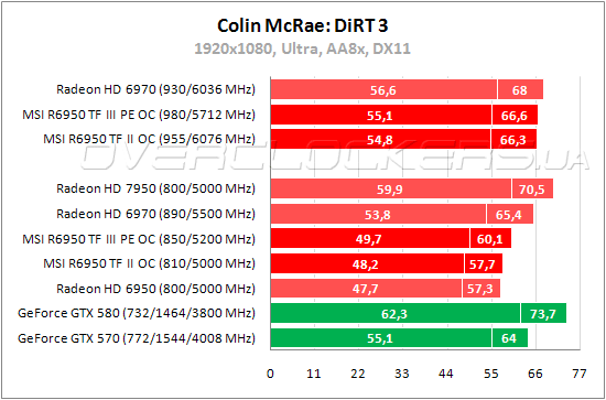 R6950 Twin Frozr III Power Edition производительнее референса на 5% и уступает старшему Radeon HD 6970 около 9%. Отставание от GeForce GTX 570 достигает 6% по среднему fps и 11% по минимальному показателю. Разгон поднимает результаты старшей карты MSI на 11—14%. Twin Frozr II в разгоне проигрывает напарнику жалкие доли процента.