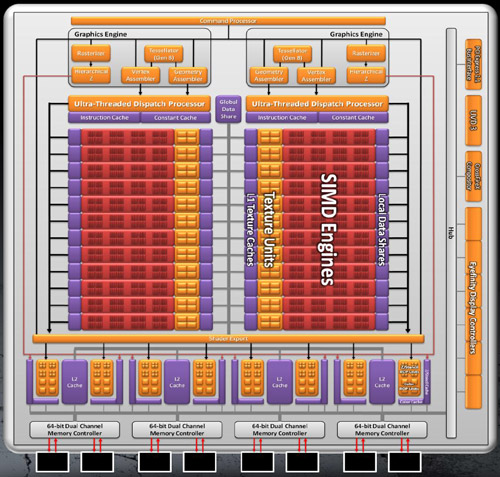В конечном итоге количество потоковых процессоров составило 1536 шт., тогда как в Cypress их 1600. Но это вряд ли негативно повлияет на быстродействие нового GPU, тем более, что его частота стала немного выше — 880 МГц против 800 МГц. Частота памяти GDDR5 также была увеличена — до 5500 МГц, хотя разрядность шины составляет прежние 256 бит. А вот объем видеобуфера, не долго думая, сделали в два раза больше, и теперь он равен целым 2048 мегабайтам, что особо будет полезно при высоких разрешениях экрана и в режиме CrossFireX.