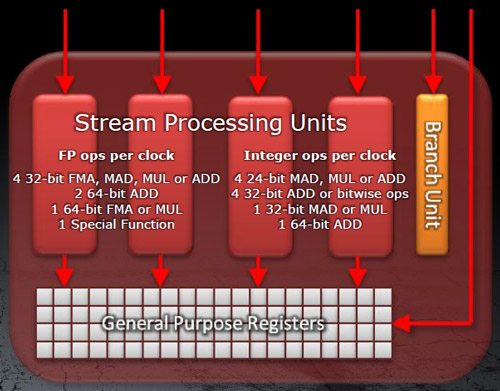 Но самое главное то, что AMD отказалась в суперскалярных процессорах от пятого ALU (T-unit), способного исполнять сложную инструкцию (Special Function) — теперь его роль распределяется между тремя из четырех оставшихся. Такой подход по заверению разработчика позволяет увеличить производительность до 10% на квадратный миллиметр площади кристалла.