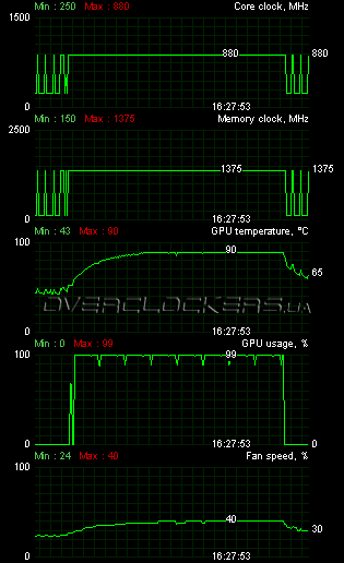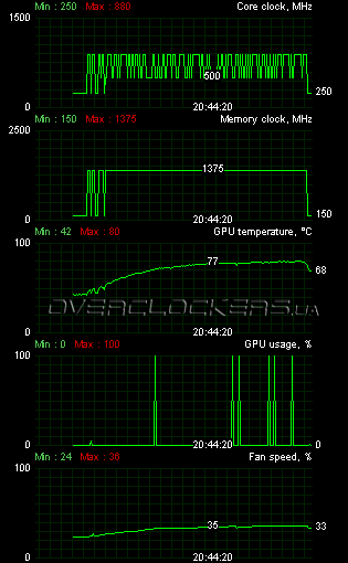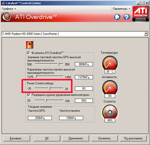 Если ползунок в ATI Overdrive переместить к -20%, частота GPU будет изменяться в пределах 880-500 МГц (при большей нагрузке она будет снижаться, при меньшей — наоборот, повышаться), тем самым снизится энергопотребление и тепловыделение карты.