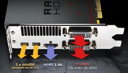 Количество разъемов для подключения мониторов увеличилось и теперь вместо одного стандартного DisplayPort пользователям будет доступно два miniDP версии 1.2. Поддержка Eyefinity осталась на месте.