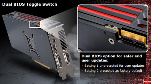 Из приятных моментов для энтузиастов отметим поддержку Dual BIOS и специальный переключатель возле разъема CrossFire, позволяющий выбрать тот или иной чип с микрокодом. Одна версия предназначена для постоянного обновления, а вторая защищена от записи для предотвращения порчи информации. Это будет особо полезно любителям перепрошивать карты — если выйдет из строя одна микросхема, то можно будет и дальше использовать акселератор.