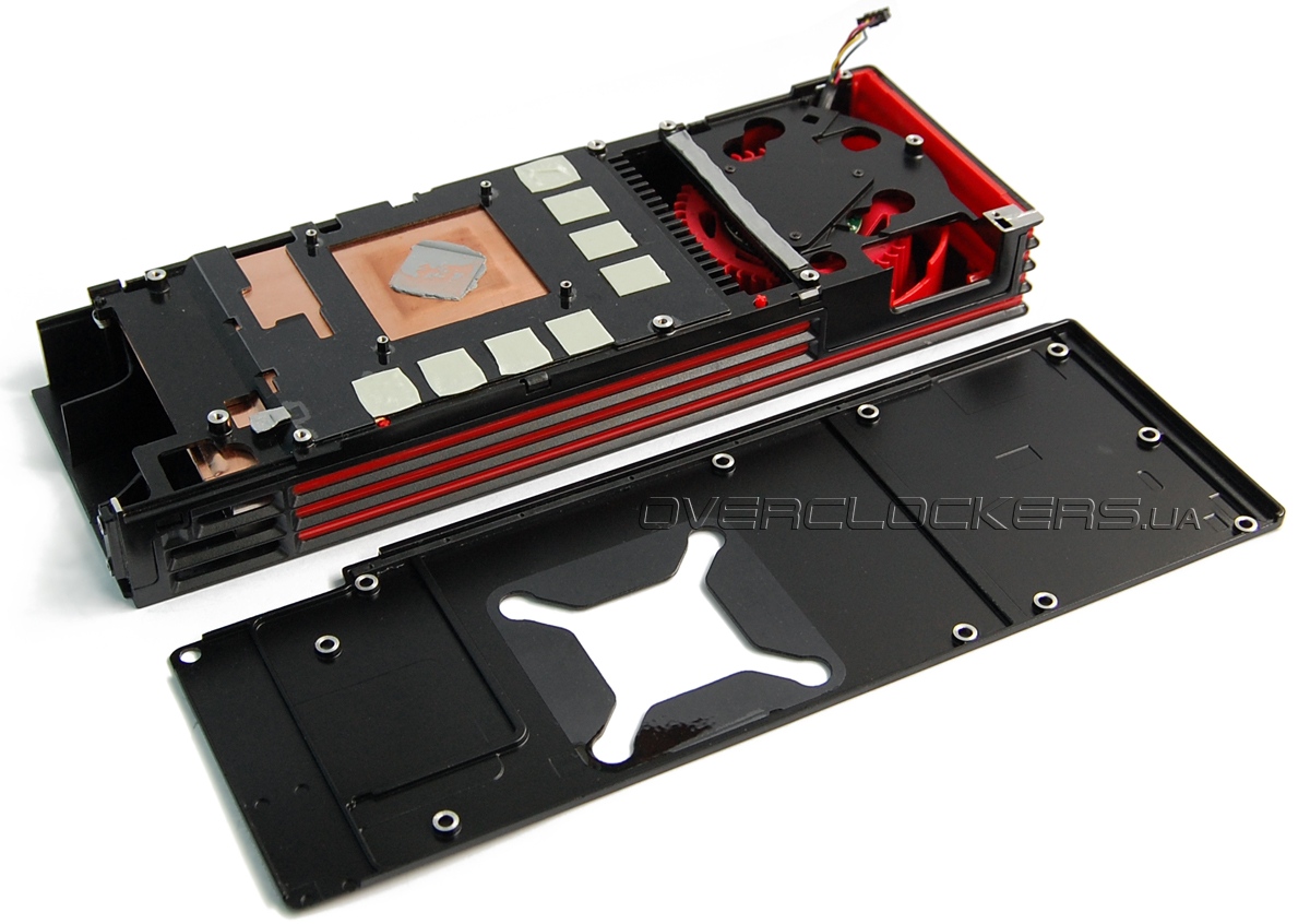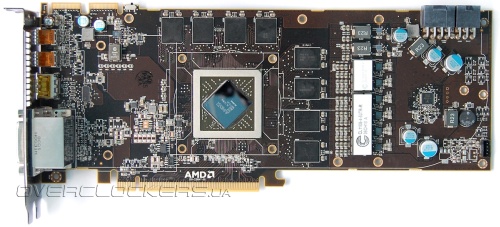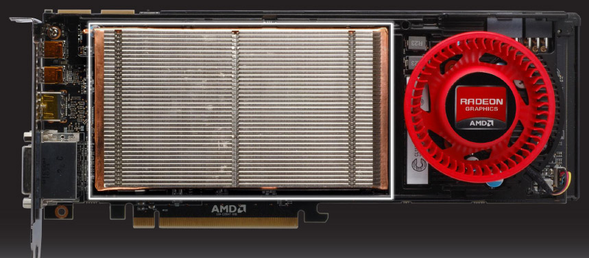 Пластина на обратной стороне платы не охлаждает микросхемы памяти, как это было у Radeon HD 5870 или Radeon HD 5970. Все чипы GDDR5 распаяны на лицевой стороне. Конструкция турбины вполне типичная и включает основной радиатор для охлаждения ядра и металлическое массивное основание, играющее роль теплоотвода для памяти и силовых элементов системы питания. Только вместо традиционных тепловых трубок референсные карты на базе Cayman оснащены радиатором c испарительной камерой.