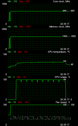 Повышение Power Control немного помогло в разгоне. Карта смогла работать на более высоких частотах, но стабильности на них добиться все равно не удавалось. Плюс ко всему мы еще заметили мизерное падение производительности в некоторых бечмарках (до 0,2%) при повышении предела Power Control даже на небольшом разгоне. В итоге мы все равно остановились на частоте 965 МГц, которая покорилась ядру даже при номинальном напряжении. Это тоже весьма хороший результат. Память разогналась до 1565 (6260) МГц. Стабильность в таком режиме была возможна лишь при повышенных оборотах турбины.