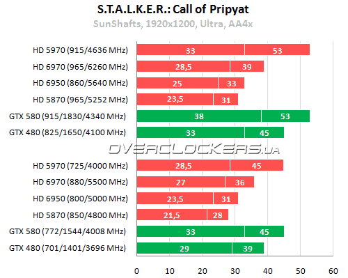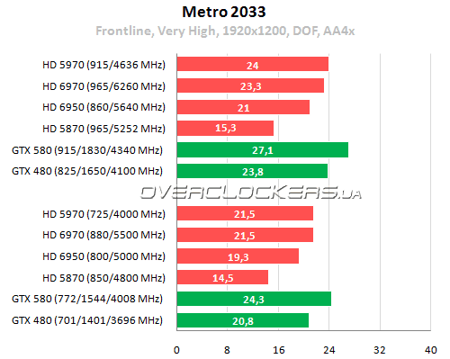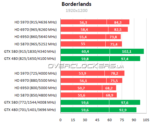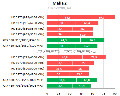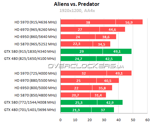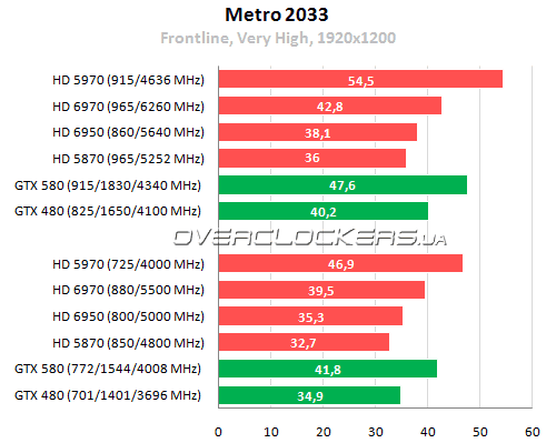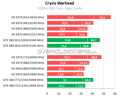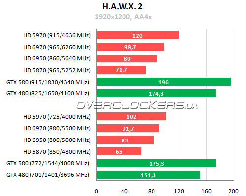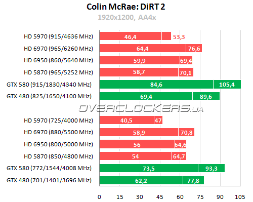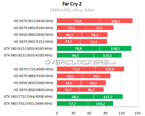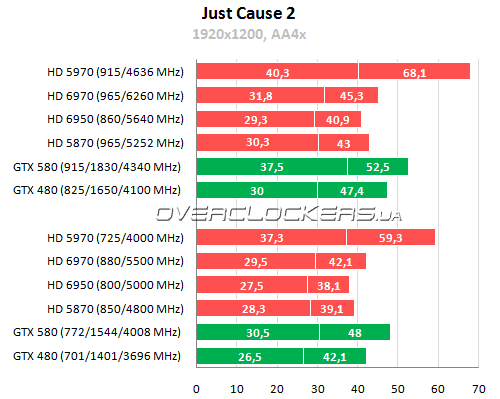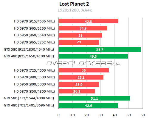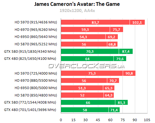 В данной игре аутсайдером является Radeon HD 5870. Старший Cayman достигает уровня производительности GeForce GTX 480 лишь при разгоне до 965/6260 МГц.