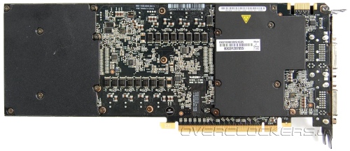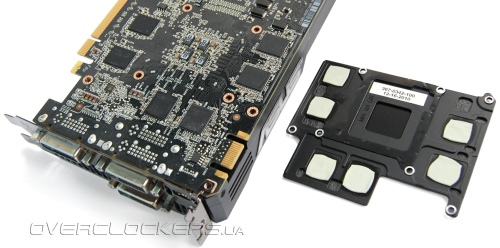На задней стороне есть две пластины-радиатора, которые накрывают микросхемы памяти. Остальная часть платы лишена какой-либо защиты.