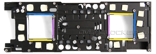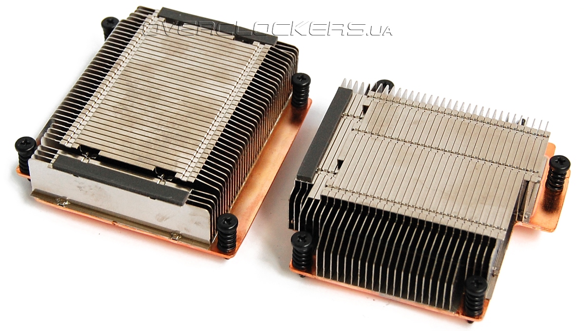Радиаторы на GPU имеют разную форму из-за разъемов питания, которые «съедают» часть объема у одного из них. Основание их — испарительная камера, на которую напаяны тонкие алюминиевые пластины.
