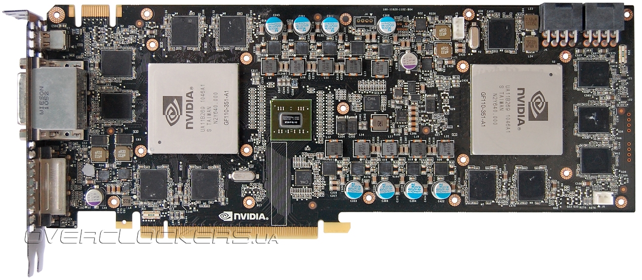 Переходим к двуглавому монстру от NVIDIA. В основе его два графических чипа GF110. И это немного удивительно, ведь они еще горячее и прожорливее Cayman.
