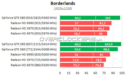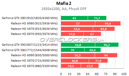 GeForce GTX 590 вырывает победу у Radeon HD 6990 с крошечным преимуществом в пару процентов. Последний превосходит своего предшественника в лице HD 5970 почти на 21%. С HD 6970 разница достигает 68% по минимальному fps и около 50% по среднеигровому показателю, который больше зависит от мощности CPU.