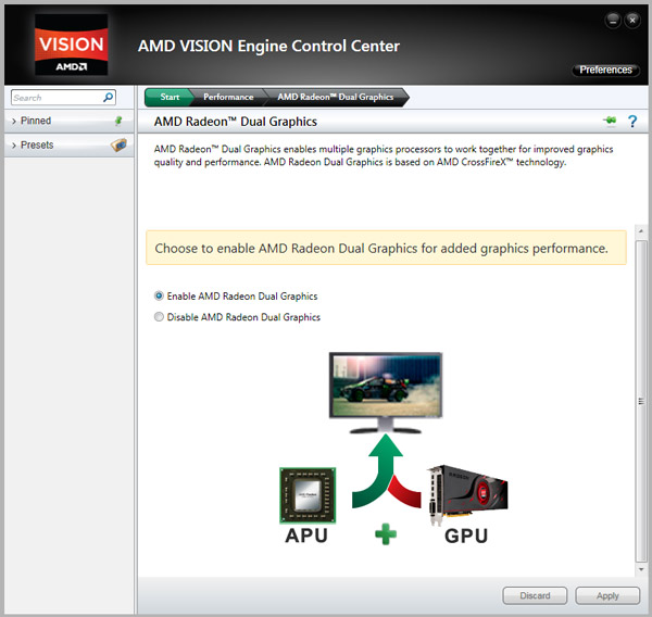 Несмотря на не самые продвинутые характеристики, Radeon HD 6570 позволяет активировать режим Dual Graphics, который объединяет ресурсы дискретного видеоакселератора и графического ядра, встроенного в APU Trinity, в связку CrossFireX. Для активации Dual Graphics достаточно установить графический ускоритель в свободный слот PCI-E 2.0 x16 на системной плате, а также активировать соответствующую опцию в UEFI Setup. После этого драйвер сам предложит включить режим Dual Graphics.