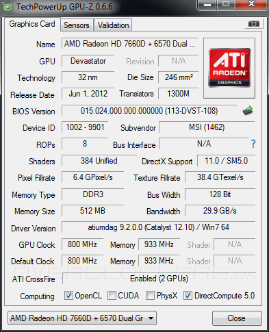 Прежде чем приступить к изучению конфигурации Dual Graphics вспомним основные особенности видеоядра Devastator, которым оснащаются A-Series второго поколения. В основе интегрированной видеокарты лежит архитектура VLIW4, используемая в дискретных акселераторах AMD Radeon 6-й серии. В своей максимальной конфигурации графический процессор Radeon HD 7660D состоит из 384 унифицированных шейдерных процессоров, 24 текстурных блоков и 8 модулей растеризации. Поддерживается API DirectX 11, а совместимость с OpenCL обеспечивает ускорение неграфических вычислений. Подобно большинству современных видеокарт в составе Devastator имеются блоки аппаратного декодирования видеопотока (UVD3), а также Video Codec Engine (VCE), разгружающие процессорные модули при обработке видеофайлов Full HD. Для формирования кадрового буфера используется область оперативной памяти, а для связи графического ядра с контроллером памяти используется 256-битная шина Radeon Memory Bus. Тактовая частота интегрированной видеокарты зависит от модели гибридного процессора, например, для AMD A10-5800K она составляет 800 МГц.