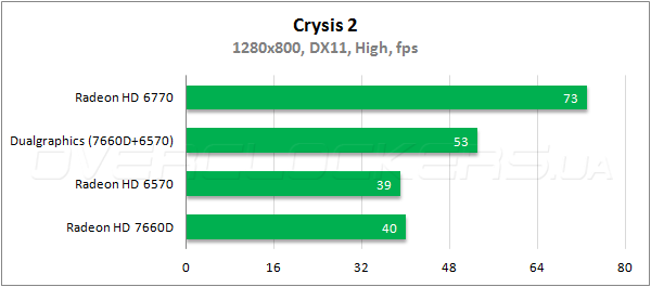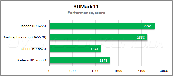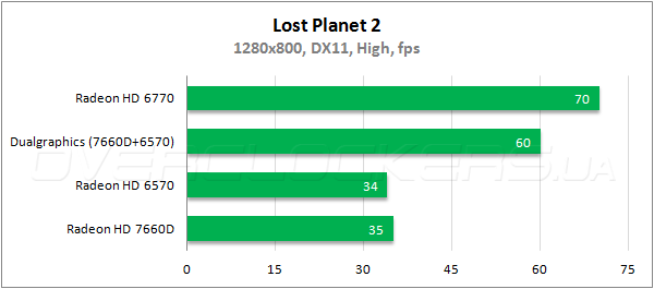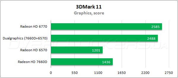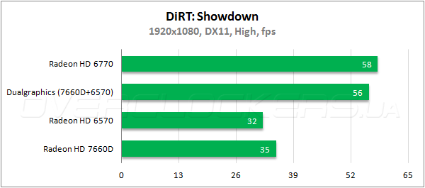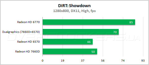 Встроенное в APU Trinity графическое ядро с легкостью расправилось с видеокартой начального уровня Radeon HD 6570, а их объединение в Dual Graphics обеспечило до 70% прироста быстродействия. Впрочем, этого оказалось недостаточно, чтобы опередить графический акселератор Radeon HD 6770, хотя, преимущество последнего не слишком велико.