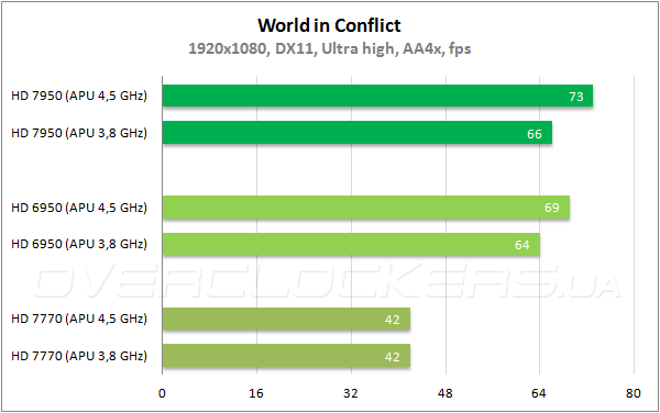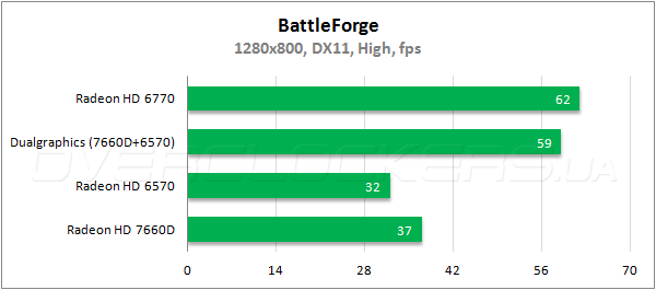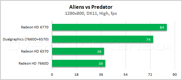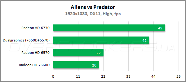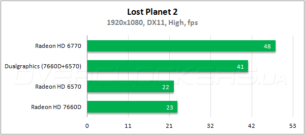 В итоге, Radeon HD 7660D и Radeon HD 6570 смогли обеспечить комфортный геймплей только в разрешении 1280х800, тогда как в режиме 1920х1080 лишь их объединение позволило получить приемлемое значение fps. При этом, даже организация Dual Graphics, которая дает до 75% прироста, выглядит не слишком впечатляюще на фоне результатов Radeon HD 6770.