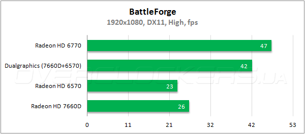 В обоих разрешениях встроенный графический акселератор оказался быстрее, чем недорогая видеокарта MSI R6570-MD1GD3/LP, а увеличение быстродействия в режиме Dual Graphics составило почти 60%. Отличный результат, но Radeon HD 6770 оказался значительно быстрее в любом разрешении.