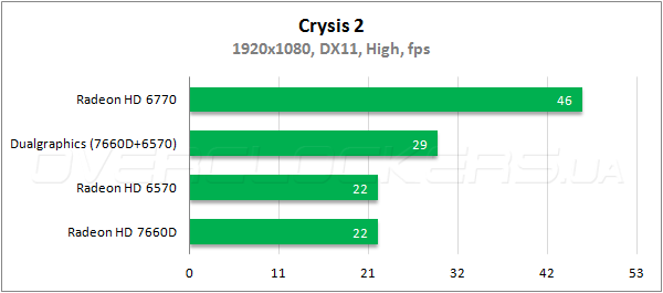 В режиме 1280х800 интегрированная видеокарта Radeon HD 7660D немного опередила бюджетный графический ускоритель. С ростом разрешения Radeon HD 6570 победила встроенный видеоакселератор, хотя, так и не обеспечила нормального fps. Что касается конфигурации Dual Graphics, то её эффективность дает практически двукратный прирост, но даже это не помогло связке одолеть middle-end трехлетней давности.