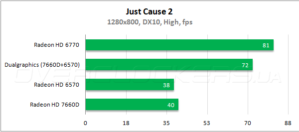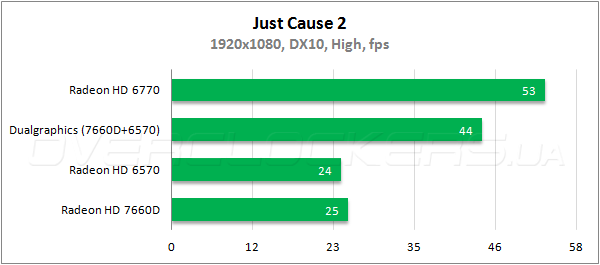 Следующая игра — Just Cause 2, несмотря на солидный возраст создает существенную нагрузку на графическую подсистему, что естественным образом отразилось на результатах. Для тестирования использовался встроенный бенчмарк на уровне «Tower».