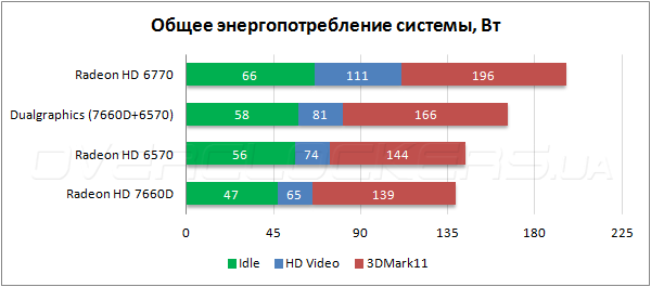 Самым экономичным оказалось встроенное видеоядро Radeon HD 7660D, сразу за ним следует графический акселератор начального уровня MSI R6570-MD1GD3/LP. Самым энергоемким стал ускоритель MSI R6770 Twin Frozr II/OC, который, впрочем, обеспечивает наилучший уровень быстродействия. Потребляемая мощность конфигурация Dual Graphics меньше, чем у видеокарты Radeon HD 6770, но первая предлагает гораздо меньшую продуктивность.