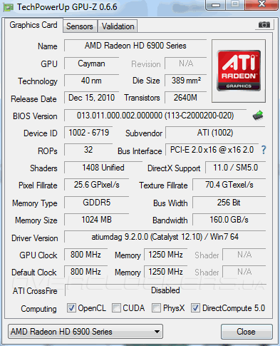 Неудивительно, что характеристики этой видеокарты в точности соответствуют эталонным спецификациям. Графический чип Cayman Pro, выполненный по 40-нм технологии, работает с частотой 800 МГц и состоит из 1408 унифицированных шейдерных процессоров, 88 текстурных блоков и 32 ROP. Ширина шины видеопамяти составляет 256 бит, а микросхемы GDDR5 работают на 4800 МГц.