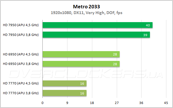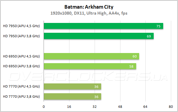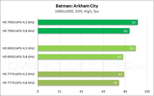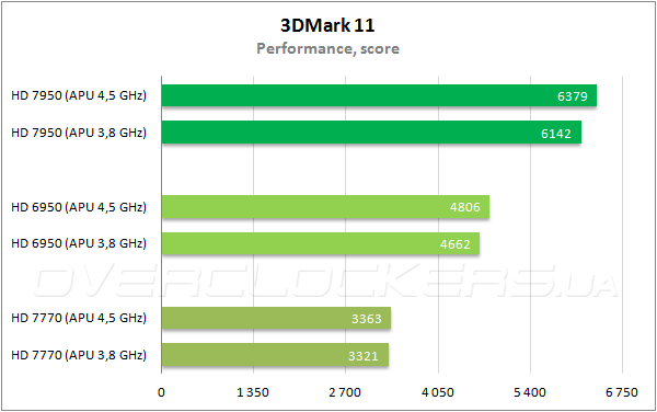 Для самого младшего участника тестирования результат не зависит от частоты APU, тогда как тестовые стенды, оснащенные AMD Radeon HD 6950 и ASUS HD7950-DC2T-3GD5, получают совсем небольшой прирост быстродействия. Также, исходя из общего балла в бенчмарке, Radeon HD 7950 быстрее акселератора среднего уровня почти на 30%. Посмотрим, сохранится ли расстановка сил в реальных видеоиграх.
