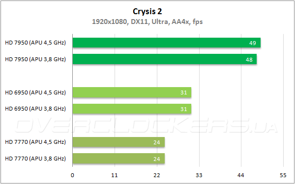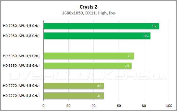 В одной из самых технологичных игр — шутере Crysis 2 — наибольшая нагрузка ложится на графическую подсистему, тем не менее, интересно оценить прирост от разгона APU.