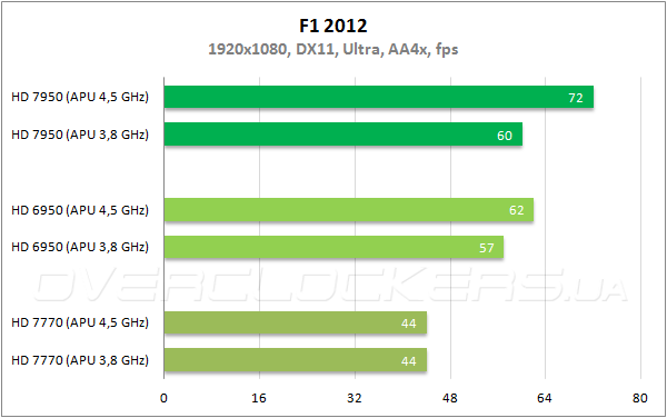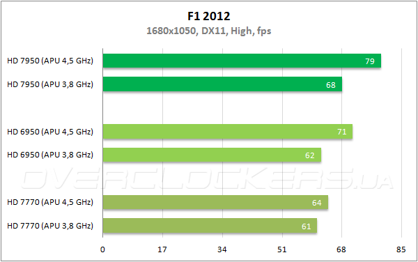 На штатной частоте APU в разрешении 1680х1050 разница между Radeon HD 7770 и Radeon HD 6950 практически отсутствует, и даже ASUS HD7950-DC2T-3GD5 опередил модели среднего и начального уровней всего на 10%. Отметим ощутимый прирост от разгона гибридного процессора, который достиг 16% для старшей видеокарты. При повышении разрешения и качества изображения, а также активации полноэкранного сглаживания, эффект от увеличения частоты AMD A10-5800K больше всего заметен для Radeon HD 7950, которому явно мало мощности процессорных ядер. Интересно, что при работе гибридного процессора на штатной частоте результаты Radeon HD 6950 и старшей модели показали почти одинаковые результаты. Так что, настоящим фанатам F1 2012 следует подыскать более производительный процессор.