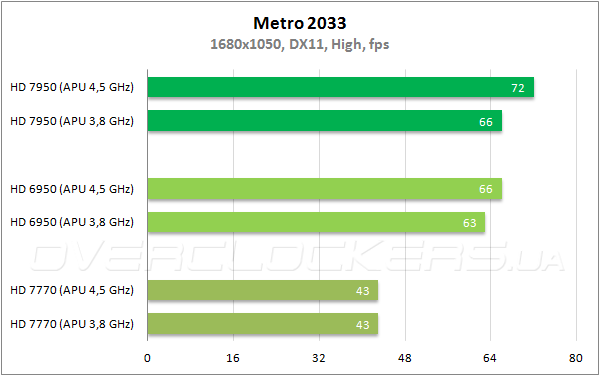 При использовании DX9 в разрешении 1680х1050 разница между Radeon HD 6950 и Radeon HD 7950 практически не наблюдалась, да и самый младший участник тестирования вплотную подобрался к результатам старших собратьев. При увеличении разрешения и активации полноэкранного сглаживания отличие между графическими картами разных классов стало более отчетливым. Что касается разгона APU, то наибольший прирост дает увеличение частоты гибридного процессора в паре со старшим ASUS HD7950-DC2T-3GD5, а вот быстродействие PowerColor AX7770 1GBD5-DH не зависит от режима работы AMD A10-5800K.