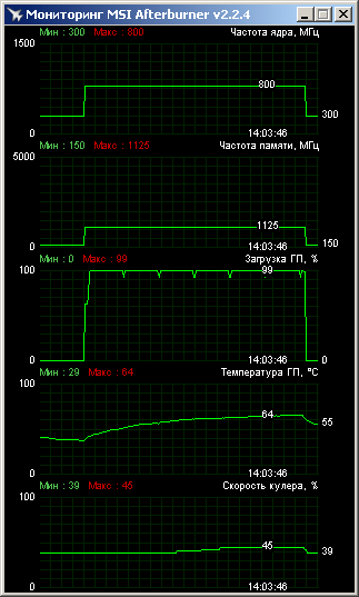 Частотная конфигурация у HIS стандартная — 800/4500 МГц для ядра и памяти. В простое частоты понижаются до 300/600 МГц.